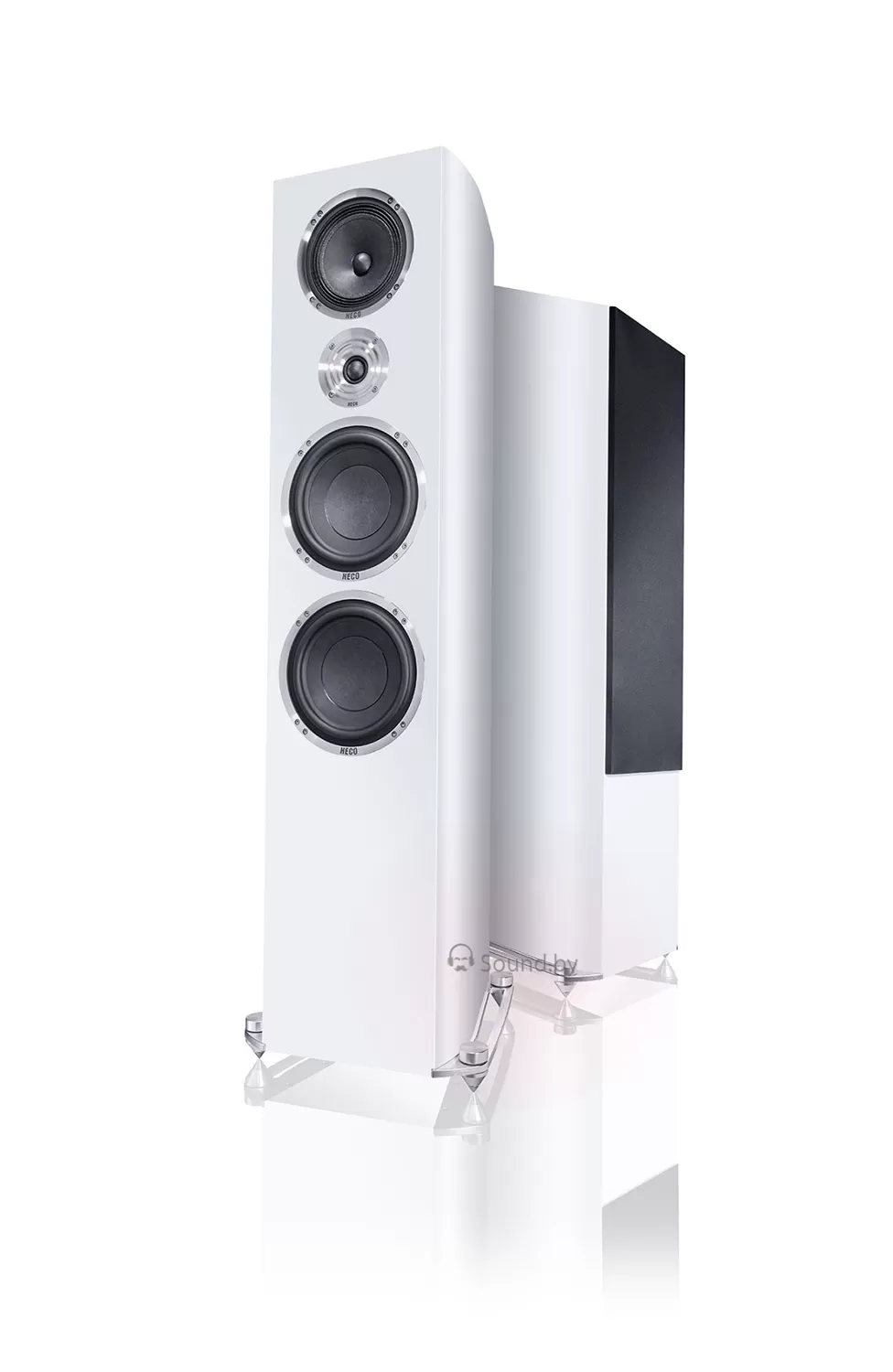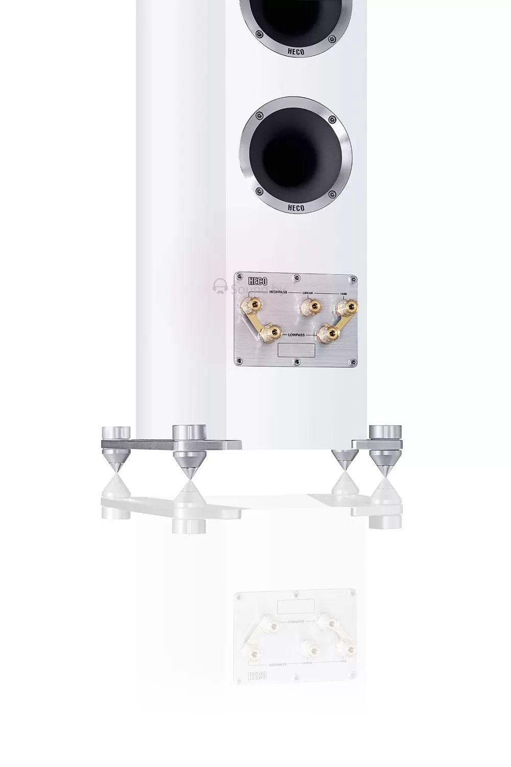 Регулируемые по высоте металлические шипы позволяют установить АС строго вертикально, обеспечивая акустическую развязку и максимально точный саундстейдж. В НЧ/СЧ секциях установлены два 200-мм вуфера и один 170-миллиметровый мидрейндж с великолепно зарекомендовавшими себя бумажными диффузорами «HECO Kraft», которые славятся своими высокими аудиофильскими качествами. Недавно разработанный твитер «Fluktus» оснащенный оптимизированным мультиволновым алюминиевым фланцем и 30-мм тканевым куполом «PFC Dome», обеспечивает точнейшую локализацию и фокусировку звуковых образов с отличной 3D сценой и тембрально естественное звучание.