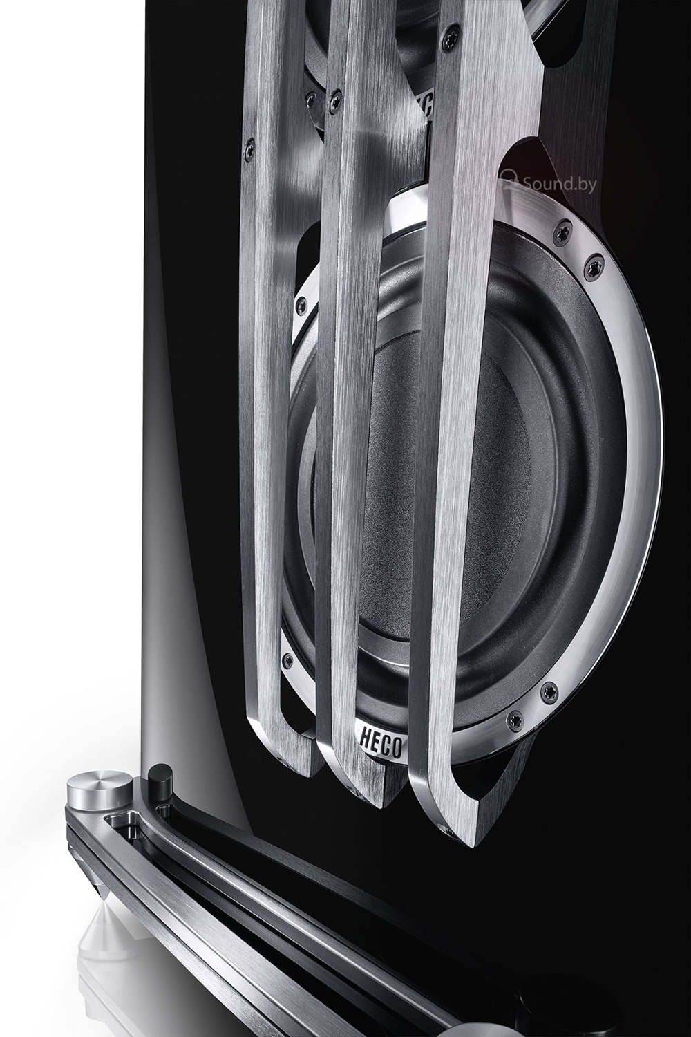 Массивный антирезонансный подиум из цельного брашированного алюминия с регулируемыми металлическими шипами со сменными наконечниками и боковые защитные грили пассивных радиаторов, для безопасной и точной установки на любые поверхности