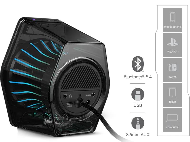 • Универсальные подключения — Bluetooth 5.4, USB-A, USB-C и AUX для работы с ПК, ноутбуками, консолями и мобильными устройствами.