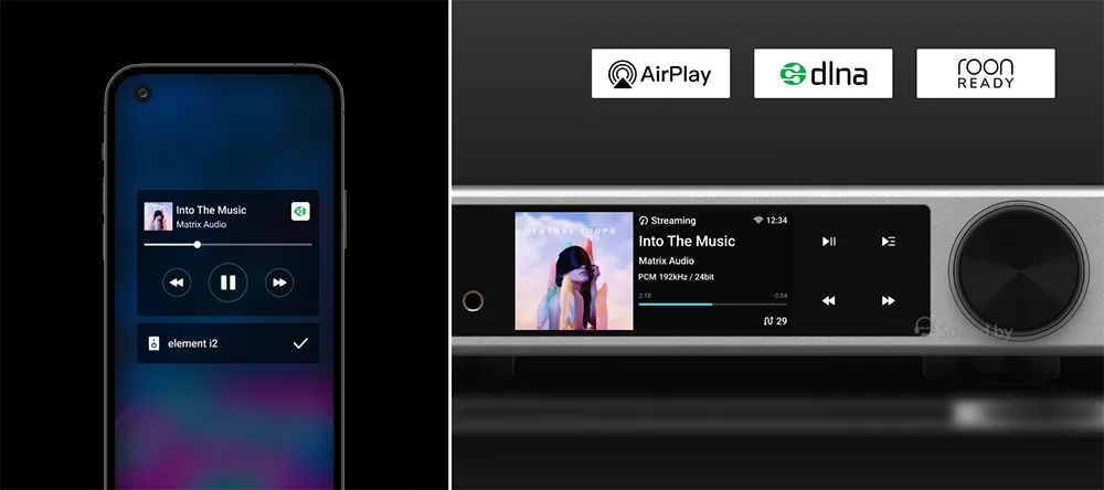 Matrix Element i2 также позволяет воспроизводить аудиофайлы со смартфона или другого мобильного устройства с использованием протоколов AirPlay 2 и DLNA.