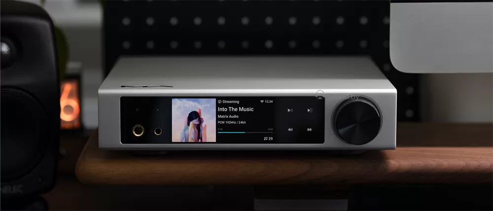 Matrix Element i2 — это и сетевой проигрыватель, и ЦАП, и усилитель для наушников в одном корпусе.Блок цифроаналогового преобразователя выполнен на чипе ES9038Q2M от Sabre Technologies, а за синхронизацию цифрового сигнала отвечает тактовый генератор Crystek CCHD-950, работающий с фемтосекундной точностью. Большой ЖК-дисплей размером 3,46 дюйма занимает практически всю переднюю панель устройства и может отображать как служебную информацию, так и обложки воспроизводимых альбомов.