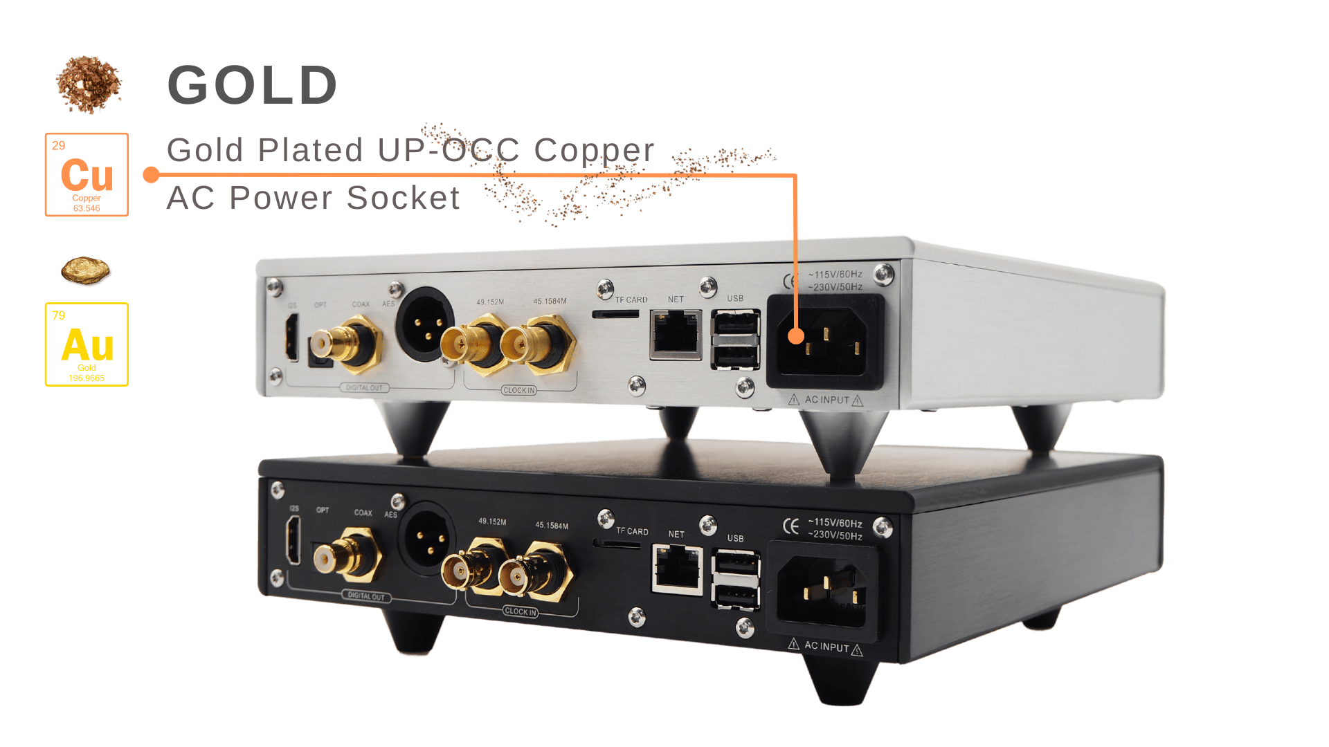 • Нестандартный разъем питания AC, изготовленный из UPOCC-меди с серебряным покрытием.