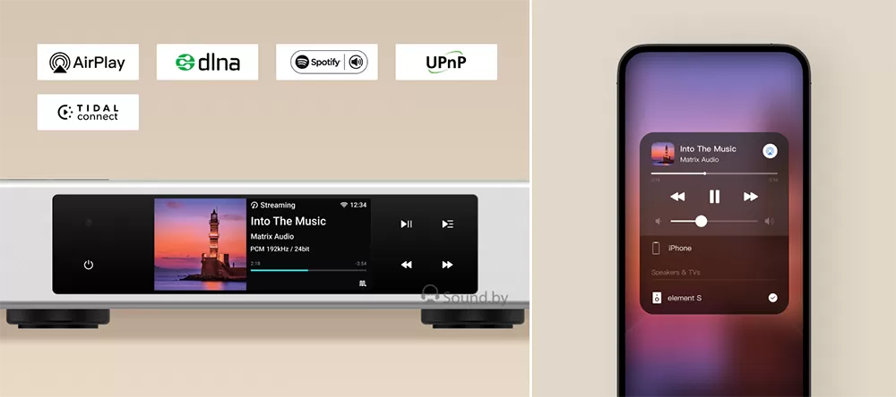 Здесь нет конвертеров цифрового сигнала и последующих аналоговых выходов. При этом у Element S есть именно то, что нужно. При габаритах среднего размера книги весит аппарат почти 2.5 кг – солидно, не правда ли? Модель построена на шестиядерном процессоре Cortex A9. И поддерживает практически все возможные источники и накопители контента: это и потоковые сервисы, и интернет-радио, и сетевые / локальные хранилища. Для борьбы с джиттером в Element S установлены два высокоточных генератора синхроимпульсов от компании Accusilicon.