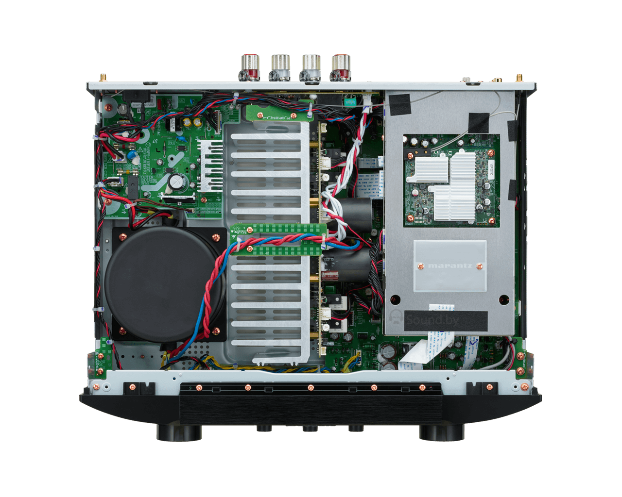 Фронтальную панель усилителя украшает трехстрочный OLED-дисплей. Поддерживается Apple AirPlay 2, двухдиапазонный Wi-Fi и Bluetooth. Доступ к аудиобиблиотекам, хранящимся на PC, Mac или NAS-серверах, осуществляется через WLAN или с помощью LAN-порта. По локальной сети и при использовании встроенного в тыльную панель корпуса USB-порта поддерживается воспроизведение форматов ALAC, FLAC, WAV до 24 бит/192 кГц и DSD до 5,6 МГц. На борту имеется MM-фонокорректор, входная секция которого использует полевые FET-транзисторы. В коммутации следует выделить отключаемый экранированный блок цифровых входов. Существует возможность подключения активного сабвуфера, а для подсоединения акустических систем задействованы две пары фирменных винтовых клемм Marantz SPKT-1+.
